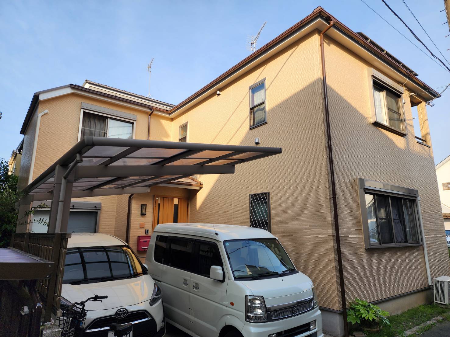市川市本塩に立つI様邸(愛様邸)は、連棟する建売住宅の2棟目として外壁塗装をご依頼いただきました。初めてお伺いした際、玄関から見える範囲は「綺麗に見えた」のですが、詳細な現地調査を進めていくと、「しっかり見たら結構裏面(家の裏側)が痛んで」いる状態であることが判明しました。これは、家の住人が「見えない、意識しないところが割と傷んでいるケースが多い」という弊社の経験 と同様に、ご家族様ご自身では気づきにくい部分に、劣化が進行していた典型的なケースでした。